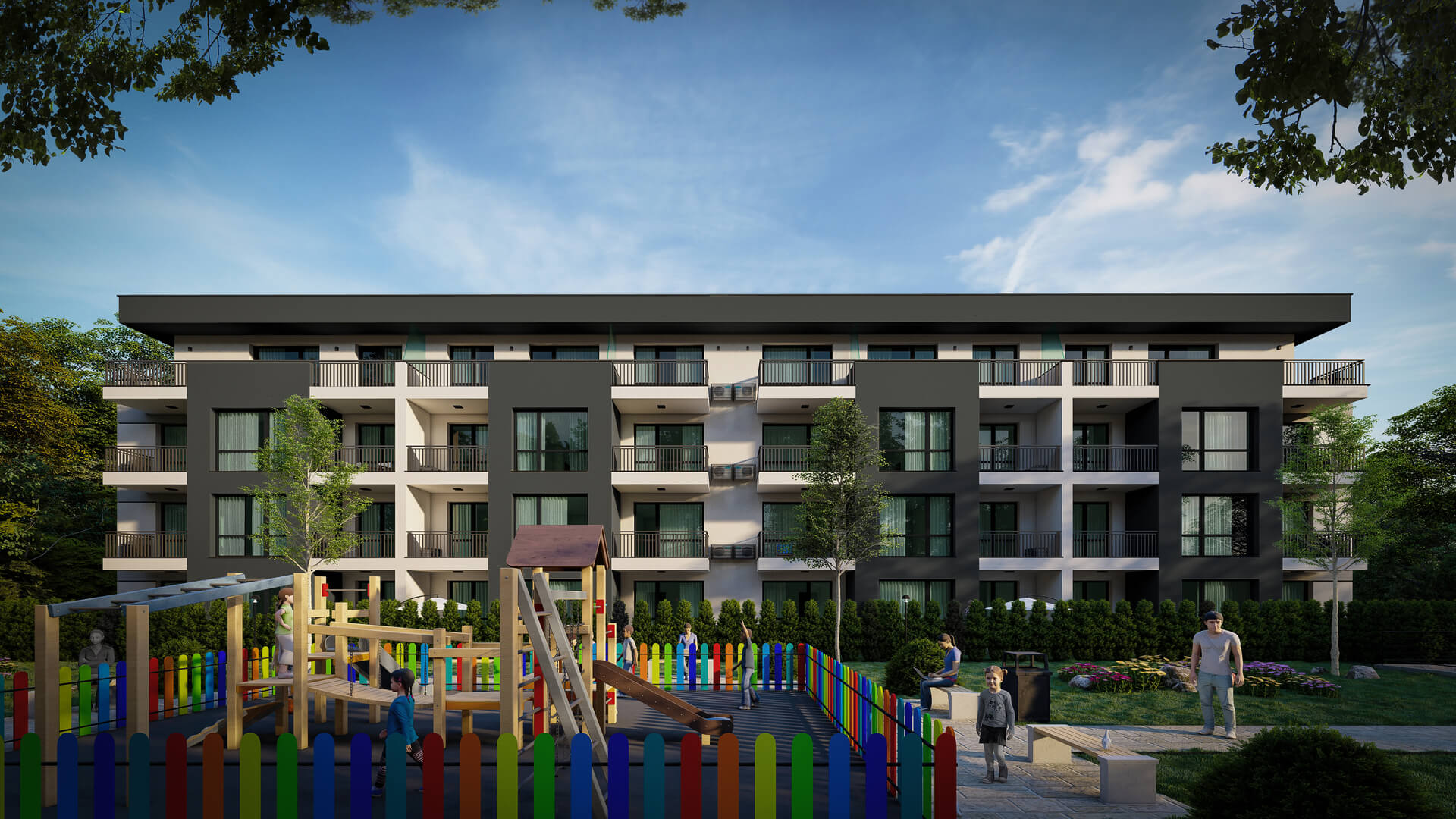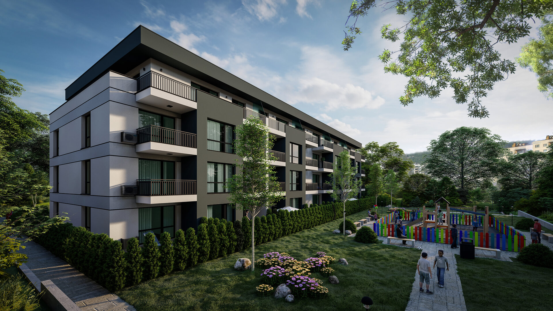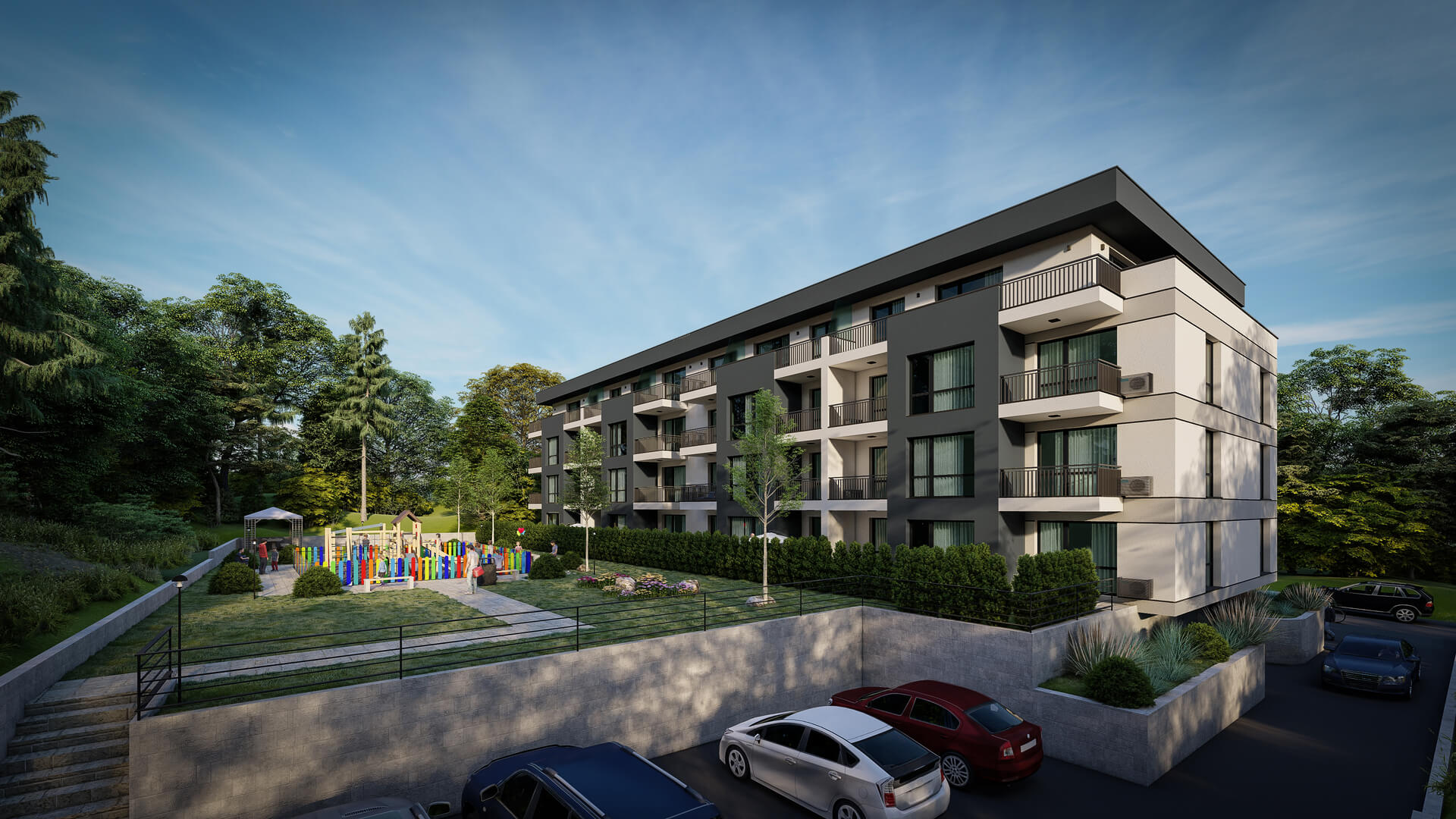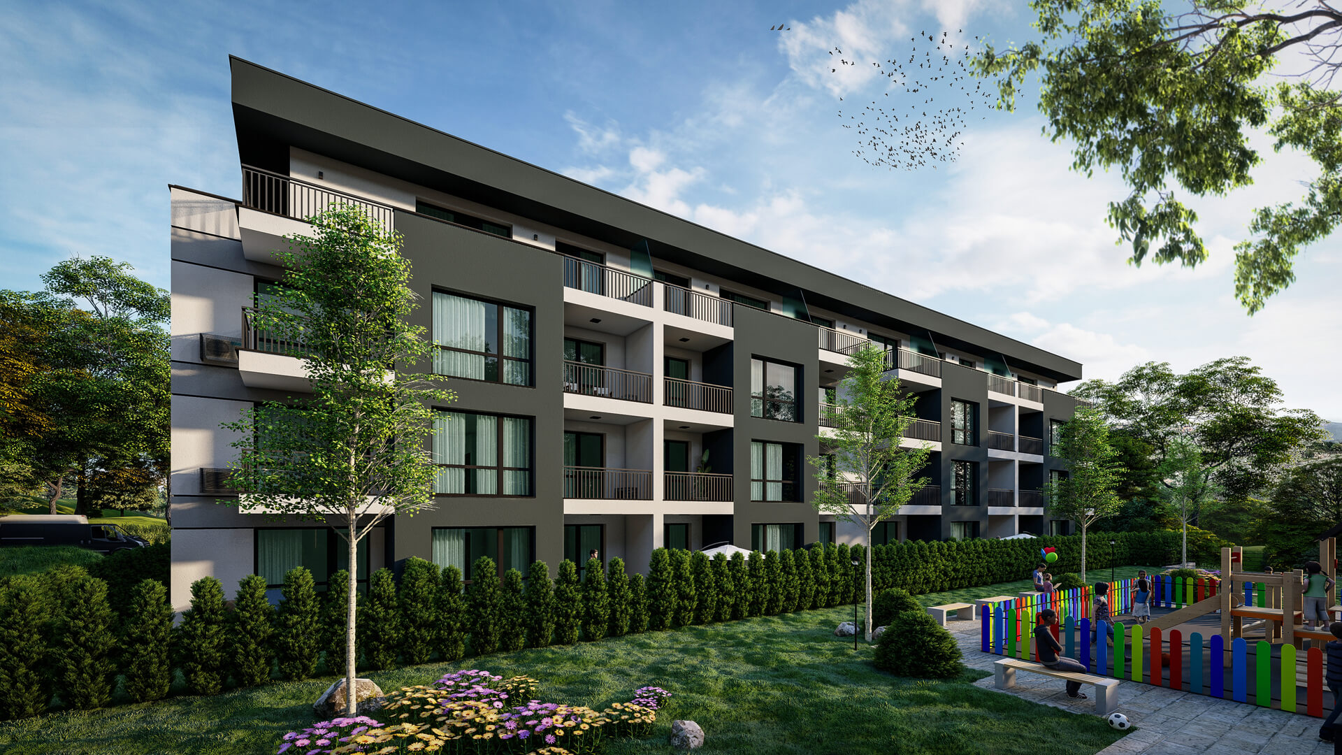 Около жилищната сграда ще бъде изграден богато озеленен двор с детски кът, алеи, пейки и беседка, които в съчетание с боровата гора в съседство осигуряват възможност за пълноценен отдих и разходки сред природата.